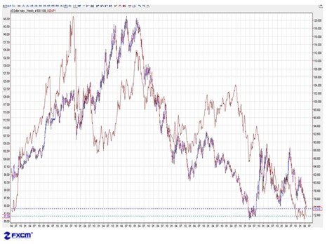 テクニカルの視点でこの問題を解釈するならば、最近の米ドル/円とドルインデックスとの相関関係を見るべきだろう。