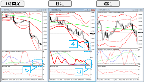 「決済の判断は主にRCIでした。日足の短期RCIが底まで降りてきて三重底になったのと(図の3)、ローソク足もボリンジャーバンドの3σにタッチしていたこと(図の4)、それに1時間足でも長い下ヒゲ陰線が出て、RCIが三重底になっていた(図の5)ので決済しました」