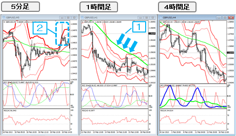 前回も2回、同じ移動平均線で抑えられていたので(図の1)、今回もそうなるかもなって思いながら、5分足を見ると、ボリンジャーバンドの3σを超えるほど大きな長い上ヒゲが出ていたので(図の2)、売りです」