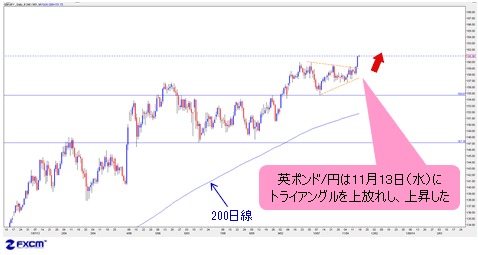 英ポンド/円の上放れポイントは、上のチャートに記しているトライアングルの上放れにあった。一昨日(13日)に上放れを果たしていたから、米ドル/円の上放れと相俟って、円安トレンドを推進するサインとして読み取れたわけだ。