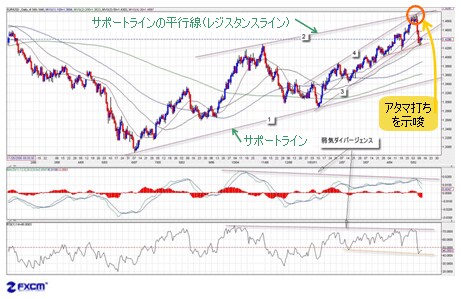 「図示のように、1番ラインはサポートラインで、平行に引かれた2番のレジスタンスラインはちょうどユーロのアタマ打ちを示唆していた。同時に、オシレーター系指標における弱気ダイバージェンスといったシグナルは鮮明で、調整されやすいことがわかる。よって、同日ではユーロの高値を追うべきではなかった」