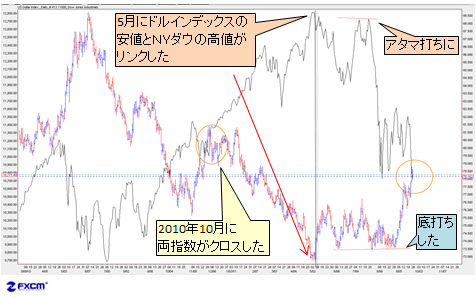 上のチャートはドルインデックスとNYダウの日足チャートだが、これを見ると、両者の逆相関性が観察できる。