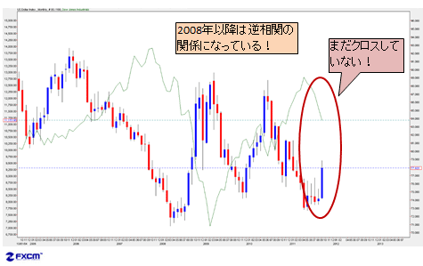 また、下のNYダウとドルインデックスの比較チャートから、2008年以降に逆相関の関係となっていることがよくおわかりいただけるだろう。
