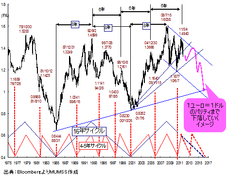 そうすると、今の16年周期が終わるのは2016~2017年ごろという計算になり、そのとき、ユーロ/米ドルは安値をつけるだろうということです。
