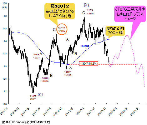 もしくは、きれいな三尊天井を作るのであれば、左の山にあたる2010年11月の高値が1.42ドル台ですから、上値のメドは1.42ドル程度ということになります(チャート上に記した戻りのメド2)」