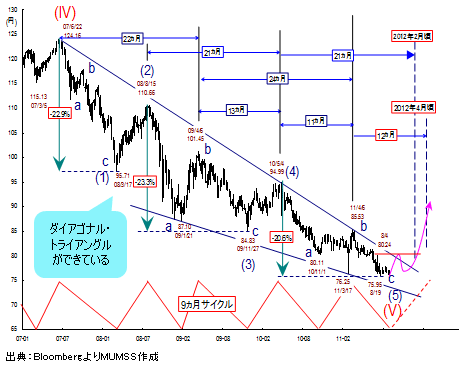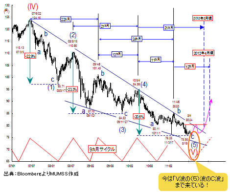 「下のチャートは2007年6月の高値124.16円以降のチャートです。先ほどの月足で出てきたV波の中身を詳しく表示したものになります。