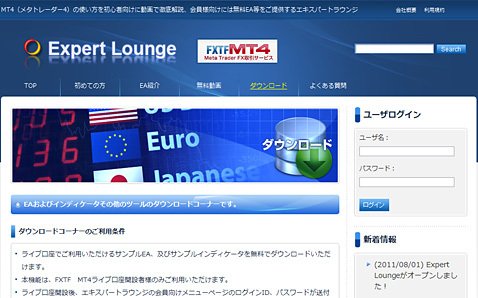 EAやインディケーターは、他のMT4採用会社では「自分で探して」というスタンスだったが、FXトレード・フィナンシャルでは口座開設者向けにMT4情報サイト「Expert Lounge」(エキスパート・ラウンジ)を用意している。