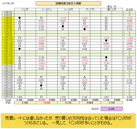 先に紹介した「日々実績データ」をもう一度見ていただきたい。じつは、ここに「○」印がついているのは、上記のケースのように売買レートには達しなかったが、売り買いの方向性は合っていたケースだ。