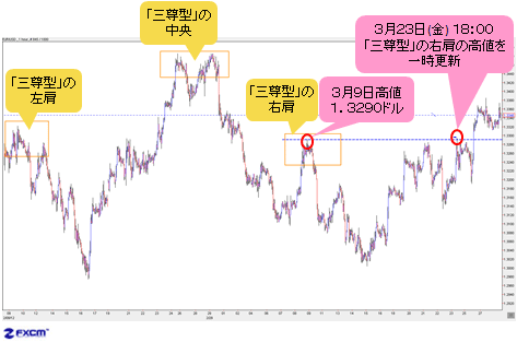 上に図示したように、ユーロ/米ドルも「三尊型」のパターンを示していたので、3月23日(金)には「教科書どおり」なら、反落していくはずだった。