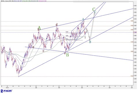 上のチャートが示しているように、13日安値からの変動を大型三段上げパターン(大文字)とみなす場合、A=Cなら、1.6090ドルといったターゲットを示し、C波序列下のa-b-cパターンも、a=cなら1.6073ドルというターゲットを示す。