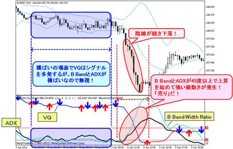 「VQが音を鳴らしたら、BBandとADXの角度を見ます。この2つがともに横ばいから45度以上の角度で右上がりになっていたら値動きの勢いが強まってきたと判断してエントリーします」