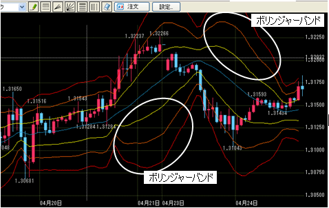 (2)「ボリンジャーバンド」が-2σ付近で反発したら買い、+2σ付近で反落したら売り。中立ゾーンまで達したら利益を確定する。
