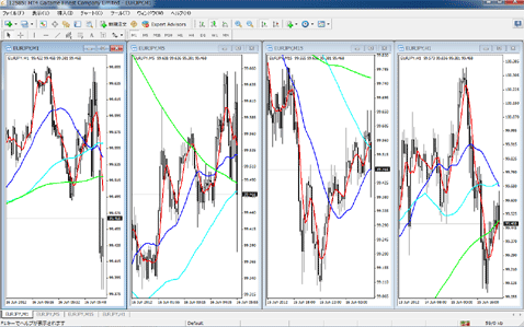 取引通貨ペアはユーロ/円や英ポンド/円、豪ドル/円が中心。1分足、5分足、15分足、1時間足や15分足、5分足などで売買の方向やサポート、レジスタンスを確認してから、1分足でスキャルしていく。一目均衡表やボリンジャーバンド、MACDなども使うが、中心となるのは5、25、75、200に設定された4本の移動平均線だ。