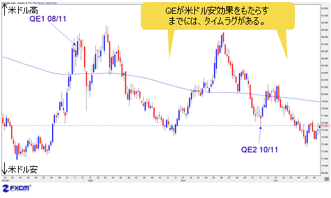 下のドルインデックスチャートでは、QE1とQE2の実施開始日を示しており、量的緩和策がもたらした米ドル安効果は、かなりタイムラグをもって効いてきていることが一目瞭然だ。