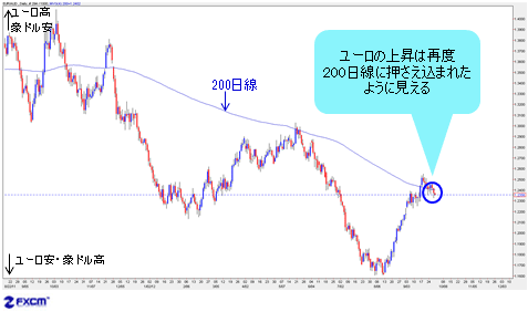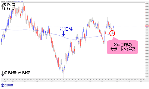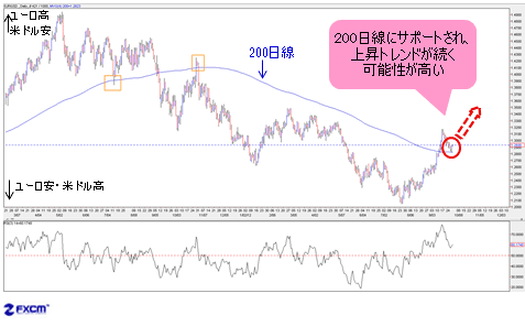 同じように、英ポンド/米ドルの日足からも、200日線がブル・ベアの分水嶺的な役割を果たしていることがわかる。