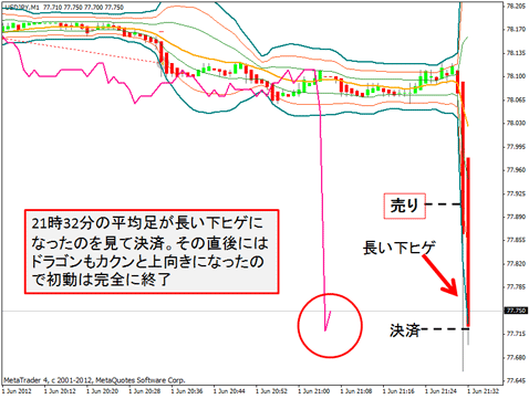 「決済はボリ平ドラゴン式のチャートを使います。ドラゴンの動きを見て、ドラゴンが少しでも勢いを弱くしたら決済。ドラゴンの向きがカクンと変わるのを待ってもいいんですが、それだと遅くなっちゃうこともある。初動だけをセーフティに狙っていきます」