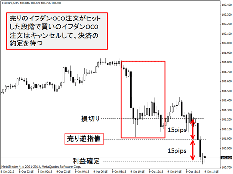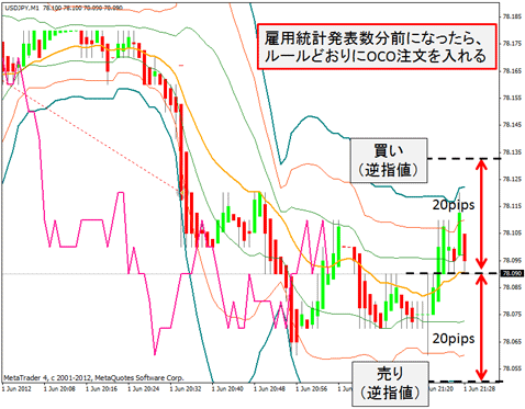 「発表1、2分前のレートを基準に上に20pips離して買い、下にも20pips離して売りの注文を入れておきます。OCO注文なら、売りと買い、どちらかが約定したら、もう一方は自動的にキャンセルされるので、動いた方向へついていけるんです」