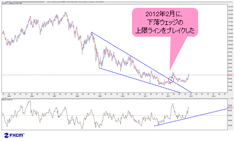 こういった結論はいろいろな視点で検証されているが、それらのうち、米ドル/円が2012年2月において急伸し、2008年の高値・安値から引かれた下落ウェッジの上放れ(ブレイク)を果たしていたことも、大きな手掛かりであった。