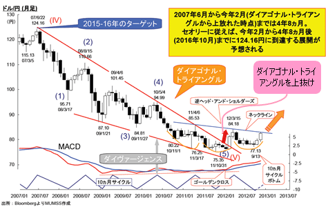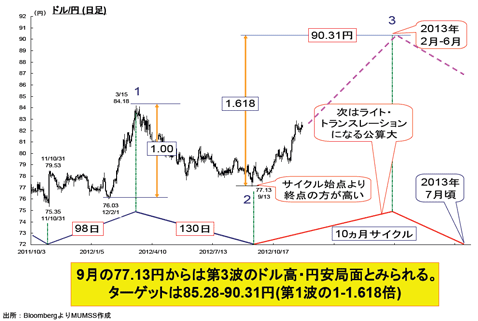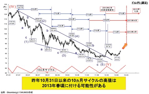 「過去5年、米ドル/円には11~13カ月もしくは24カ月ごとに高値をとるサイクルがあるんです。ここから出てくるのは2013年2~4月に米ドル/円は次の高値を取るだろうということです」