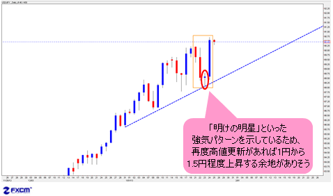短期スパンでは、昨日(1月24日)の大陽線を無視できず、21日からの陰線2本と23日の「星」に近いローソク足を合わせて考えると、「明けの明星」といった強気パターンを示しているから、再度高値更新があれば、1円から1.5円程度の上昇余地が考えられる。