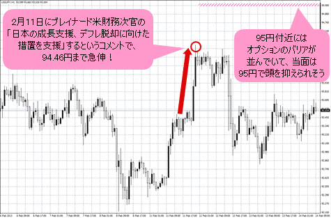 米ドル/円の95円近辺はオプションのバリアが並んでいることに加え、上記の彼女のコメントから、米ドル/円がこのレベルからさらに急伸するのも困難でしょうから、当面は95円で頭を抑えられそうです。