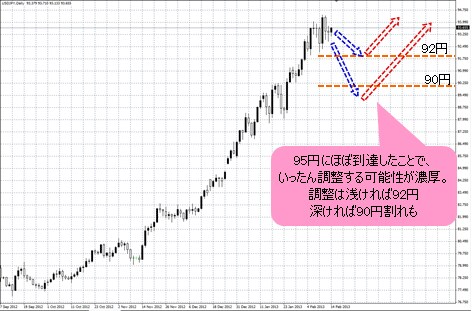 米ドル/円は95円にほぼ到達したことでも、いったん、調整局面入りする可能性が濃厚です。