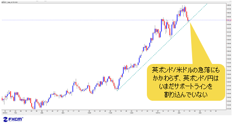 実感としては、英ポンド/米ドルの急落から考えると、英ポンド/円は144円割れとなっているものの、2012年11月安値から引かれるサポートラインをなお明確に下回らずにいること自体がサプライズであるとさえ思える。