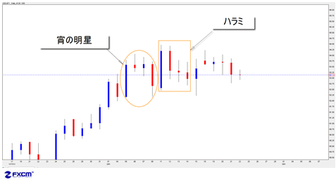 なぜなら、同フォーメーションはよくトレンドの天井に出るし、いったん成立すれば、少なくとも90円台まで反落する見通しだからだ。