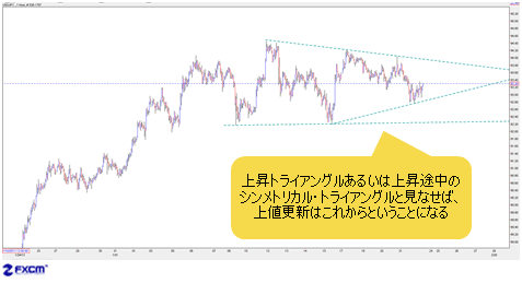 それに対して強気派は、下のチャートに示したように、同じチャートから強気のフォーメーションを見い出す。すなわち、上昇トライアングル、あるいは上昇途中のシンメトリカル・トライアングルと見なせば、上値更新はこれからだ。