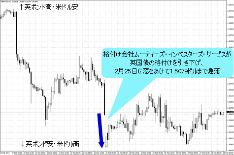 このコラムで何度かご紹介した英ポンド/米ドルも、格付け会社ムーディーズ・インベスターズ・サービスが英国債の格付けを最上位から1段階引き下げたことを受け、2月25日(月)に大きく窓をあけ、1.5079ドルまで急落したことで、こちらもひと相場が終了しました。