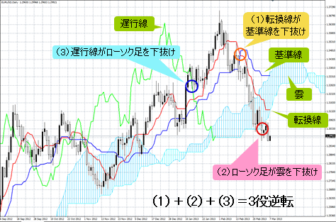 (※編集部注:一目均衡表の売りシグナルとなるパターンのこと。転換線が基準線を下抜け+ローソク足が雲を下抜け+遅行線がローソク足を下抜けた状態)