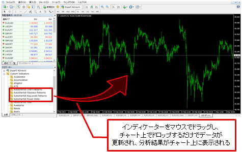 それぞれのインディケーターをマウスでドラッグし、チャート上でドロップするだけで導入完了。データが更新され、分析結果がチャート上に表示されます。