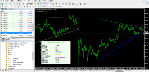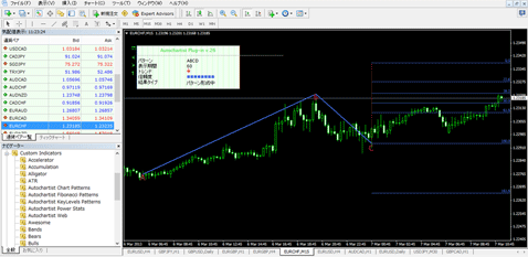 ブラウザで立ち上げたオートチャーティストでは、簡易チャートでパターンが表示されていましたが、これならMT4(メタトレーダー)チャートへダイレクトに分析結果が表示され、ビジュアル的にもなかなか見やすいですね。