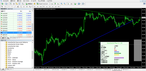 これから当記事で、オートチャーティストの主要機能をチェックしていきますが、ブラウザでオートチャーティストを起動したものとあわせて、MT4(メタトレーダー)上で表示した画像も掲載します。