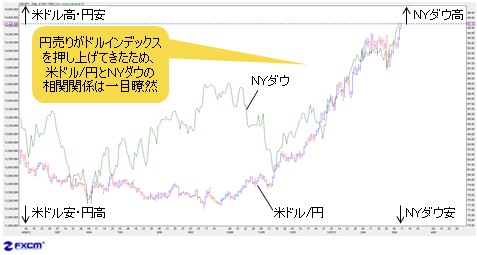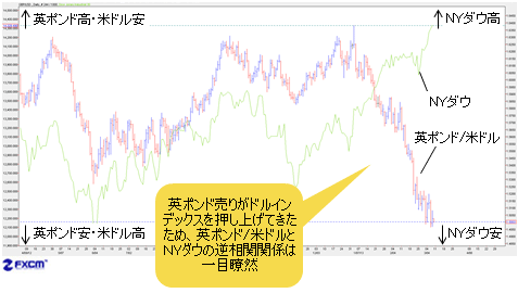 円売りと英ポンド売りがドルインデックスを押し上げてきただけに、両通貨とダウ指数の関係は、より一層、一目瞭然である。