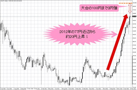 今回の米ドル/円の上昇は、2012年の77円近辺を発射台としているため、97.00円でほぼ20円、上昇したことになります。