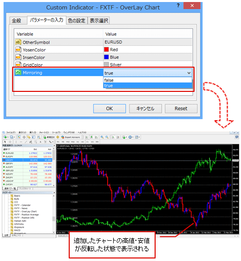 ちなみに、パラメーター設定ボックスにある「Mirroring」は、追加するチャートの高値と安値を反転させることができる機能。「true」を選ぶと追加するチャートの高値・安値が反転した状態で表示されます。