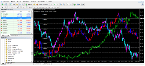 追加した通貨ペアの価格が重なって表示され、少々見づらい感じ…。足の色の選び方にも、センスが問われそう(笑)。やはり、「FXTF‐OverLay Chart」は、2つのチャートを重ねて表示するのがベストなようです…。