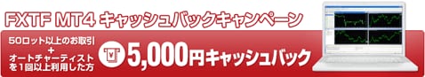 さらに、[FXTF MT4]では、新規口座開設後に、単月で50ロット以上取引をし、取引サポートツール「オートチャーティスト」を1回以上利用すると現金5000円がもらえますよ。