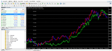 今回追加されたオリジナルスクリプトは、「FXTF‐OverLay Chart」というもの。[FXTF MT4]のチャート上で適用すると、以下のように2つの通貨ペアのチャートを重ねて表示することができ、カンタンに値動きを比較することが可能です。