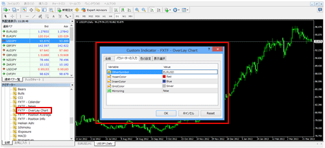 まず、[FXTF MT4]のナビゲーター「Custom Indicator」にある「FXTF‐OverLay Chart」をダブルクリックします。