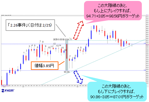 注意していただきたいのは、96.50円という計算値は3月高値に近く、また、98.40円という計算値は、前述の「2.26事件」から得られた上値ターゲットに近いだけでなく、A波から引かれる抵抗ラインとも合致していることだ。このターゲットが目先、最も有力視される。