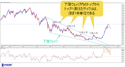 下落ウェッジ内におけるトップからトップへ数えたサイクルはほぼ1年単位であることに気がつけば、2012年3月でいったんトップアウトしていることに納得できるだろう。