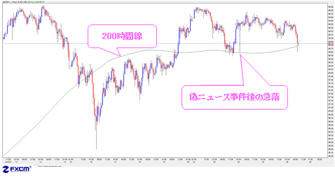 上のチャートで示したように、同事件後、米ドル/円は一時急落していたが、200時間移動平均線(200時間線)に支えられたため、これがその後の米ドルの切り返しにつながった。