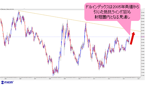 ドルインデックスは今週(5月13日~)続伸しており、2012年高値84.10の突破も確実視されている。これは2011年5月安値72.69を起点とした上昇トレンドの継続を意味し、2005年高値から引かれる抵抗ライン打診も射程圏に入る見通しだ。
