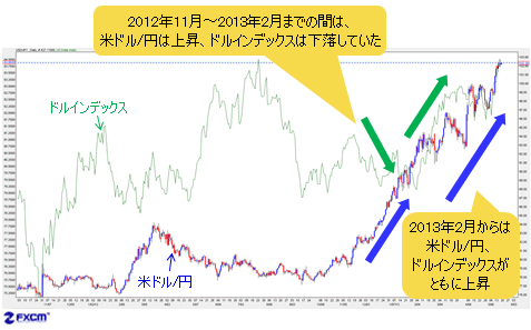 最近では、2012年11月~2013年2月までの間で両指数の相違が鮮明で、米ドル/円の上昇とドルインデックスの下落がはっきりしていた。
