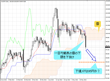 豪ドル/円の下落を緩和させていた米ドル/円の上昇が沈静化したため、豪ドル/円にも売り圧力が高まり、5月23日(木)の豪ドル/円は、日足一目均衡表の雲の下限をブレイクし、下げ足を早めています。