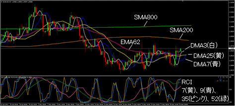 (2)移動平均線:EMA(指数平滑移動平均線)62、SMA(単純移動平均線)200、SMA800