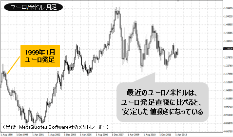 闇株新聞:ユーロはやっと最近になって基軸通貨としての地位を確立し、世界中が何の疑いもなく受け取り保有している通貨になりました。だから、債務問題が深刻化しても、1999年の発足直後に比べて安定的な変動になっているのです。