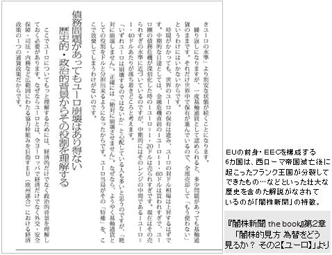 ザイFX!:『闇株新聞 the book』のユーロの章では、ユーロは「絶対に崩壊しません」と明言されています(p67)。そして、その理由についても解説されています。
